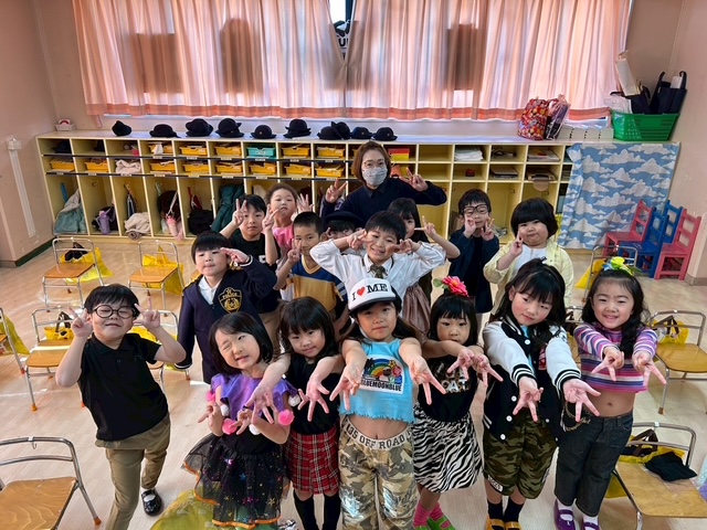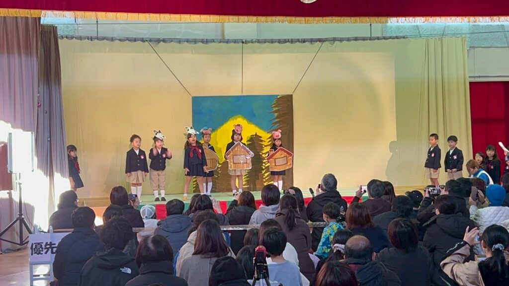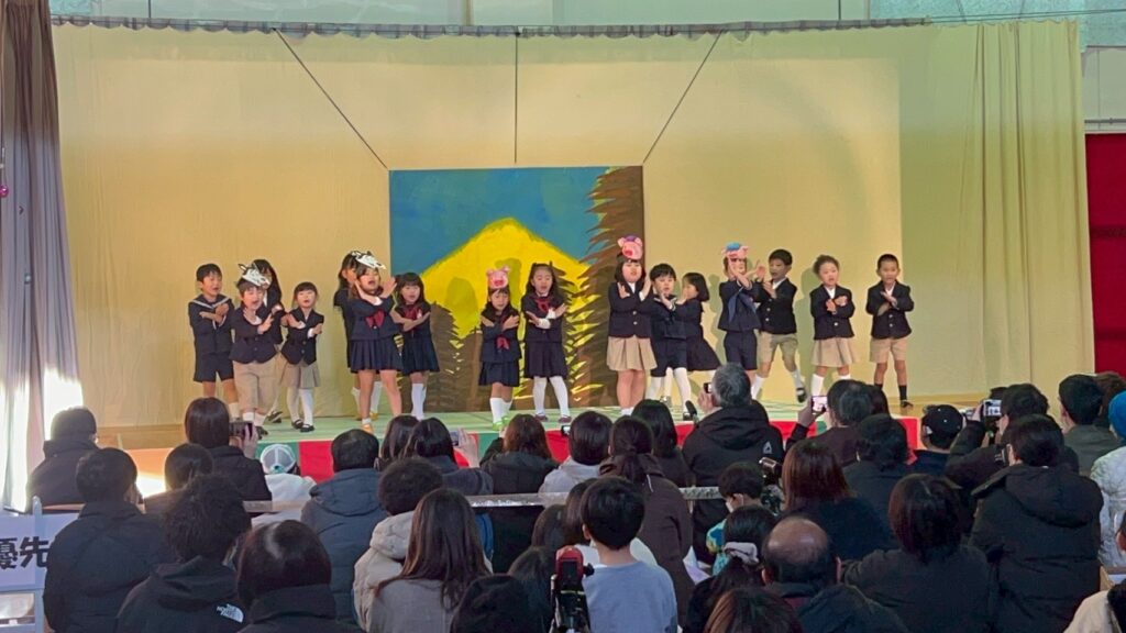 今年の年長さんクラスは、初めての英語劇「3匹の子ぶた」に挑戦した。🐷🐺