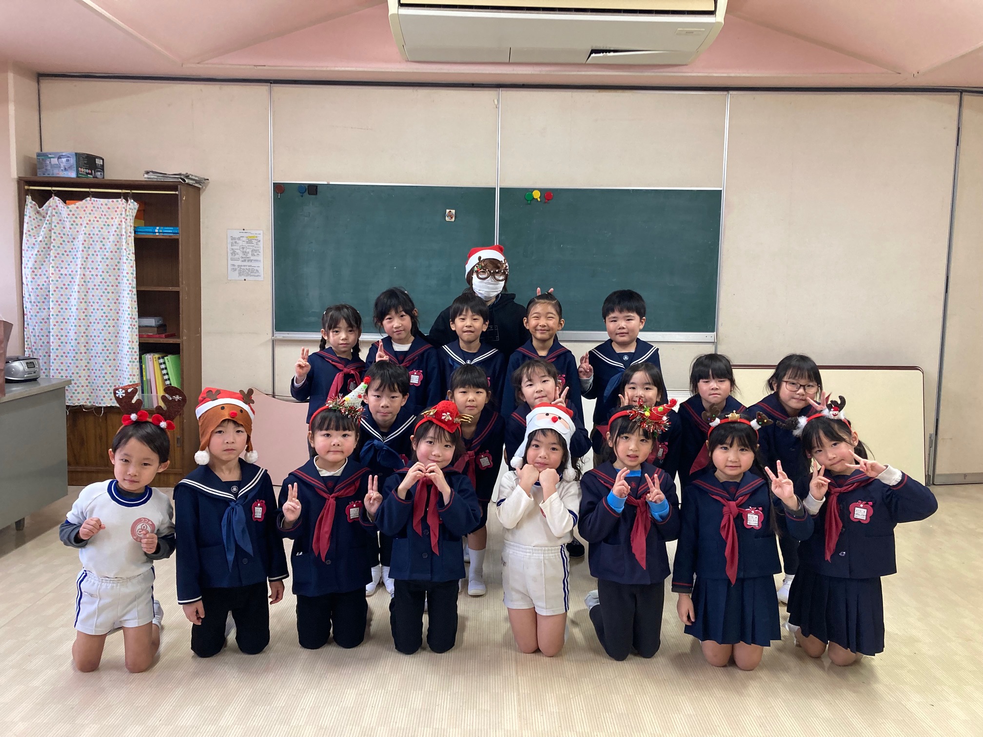 ちょっとだけクリスマスを意識してサンタ帽🎅と眼鏡👓を身につけて、いつものように「Hello!」と元気よく年長クラスに入っていくと、園児たちが「Wow!!」「Hello!」と大喜び!😃そして、続けて…
